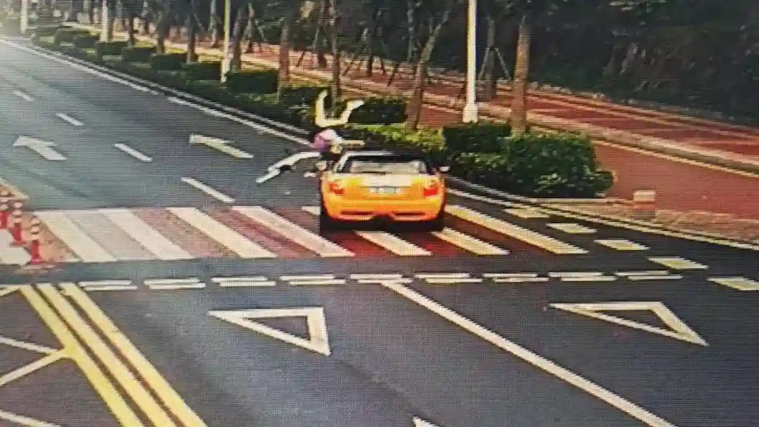 一名紫衣女子骑小蓝车沿海滨北路南往北方向行驶,大概骑行在斑马线的边缘位置。过了路中间双黄线,mini小车快速驶到,司机没有减速刹车,而是向右打方向避让,但已经来不及。小车将小蓝车撞出十几米,而骑车女子撞到小车挡风玻璃后,重重摔在地上。▼