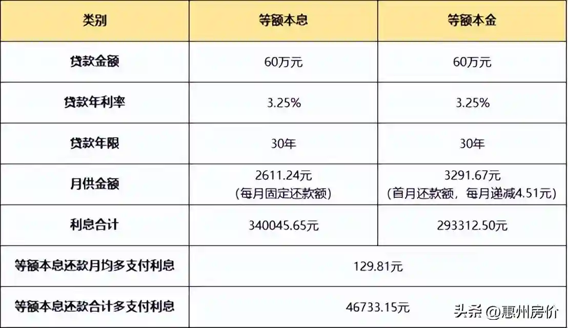 可见,等额本息所支出的总利息要比等额本金所支出的总利息多,并且贷款期限越长,利息相差越大。