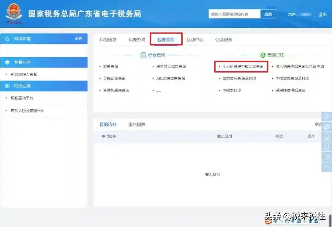 步骤三:选择“我要查询”-“查询打印”-“个人所得税申报记录查询”
