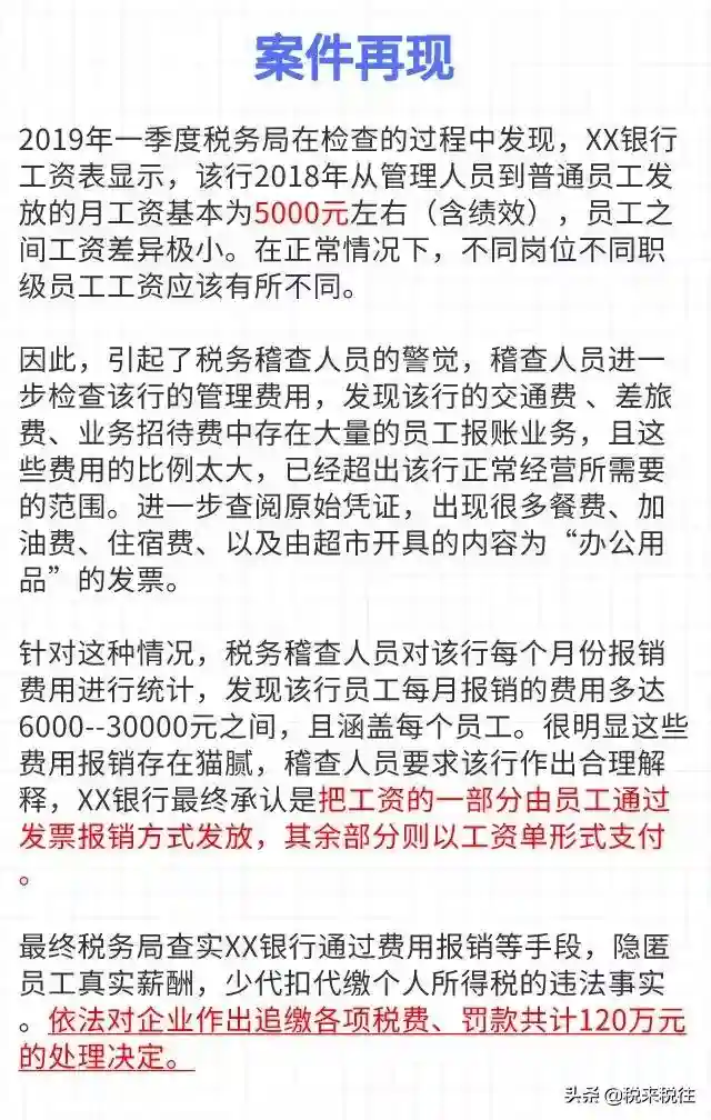 这就是最常见的拆分工资案例,工资发一部分,其他工资不是走个人账户就是鼓励员工找票给报销了!这种找发票的方法来避税,得不偿失。企业要想做大、做强偷税这个坑最好不要给自己埋下。