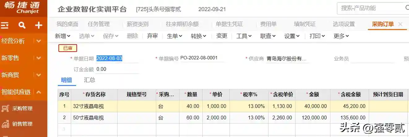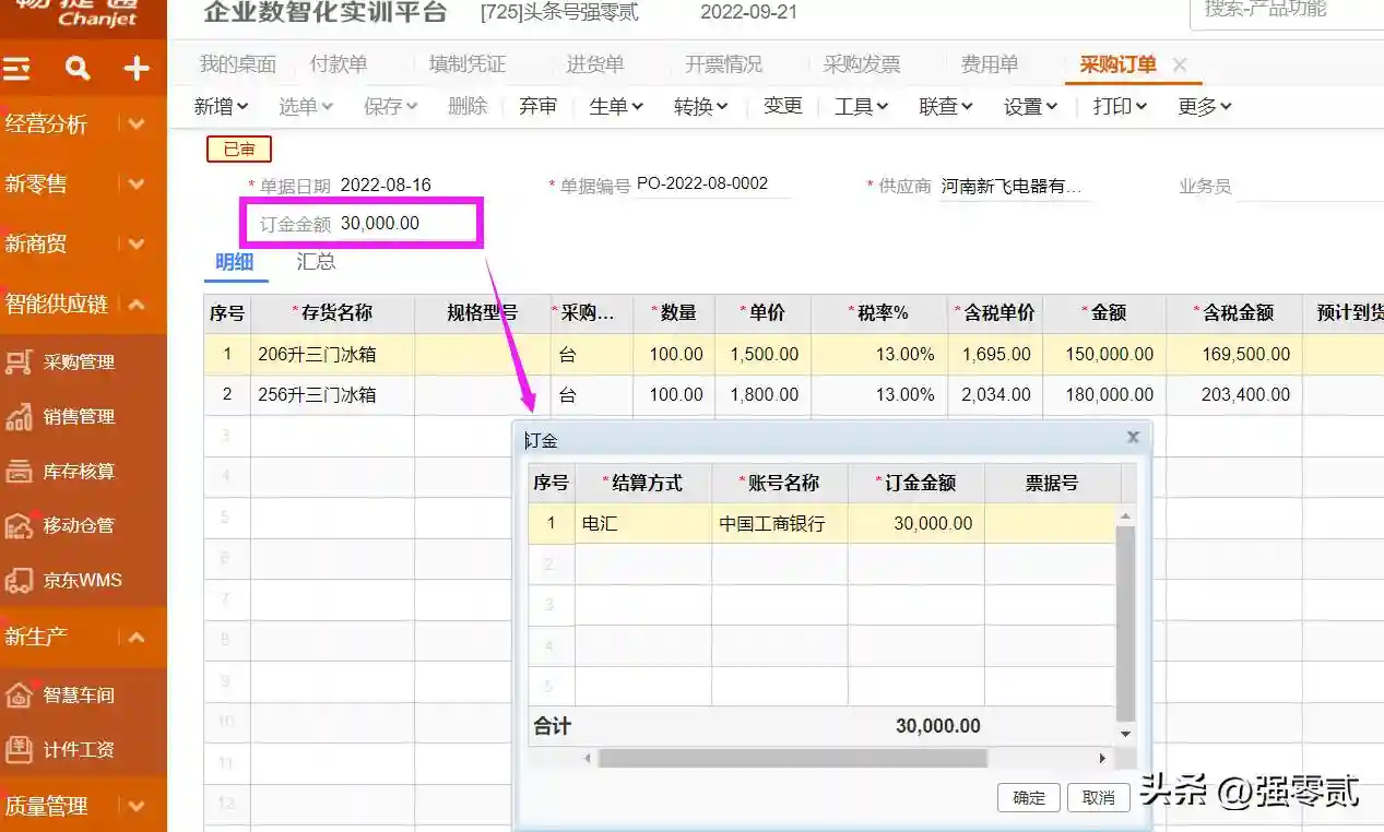 .a.【智能供应链】-【采购管理】-【采购订单】录入采购订单后,表头订金金额