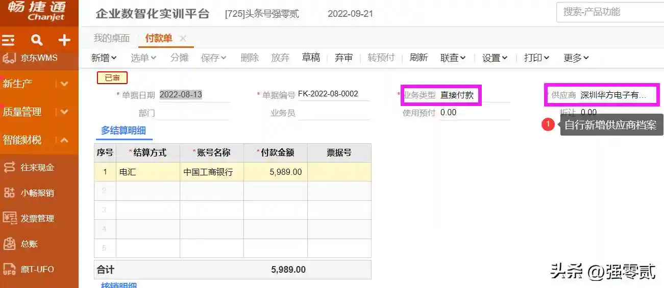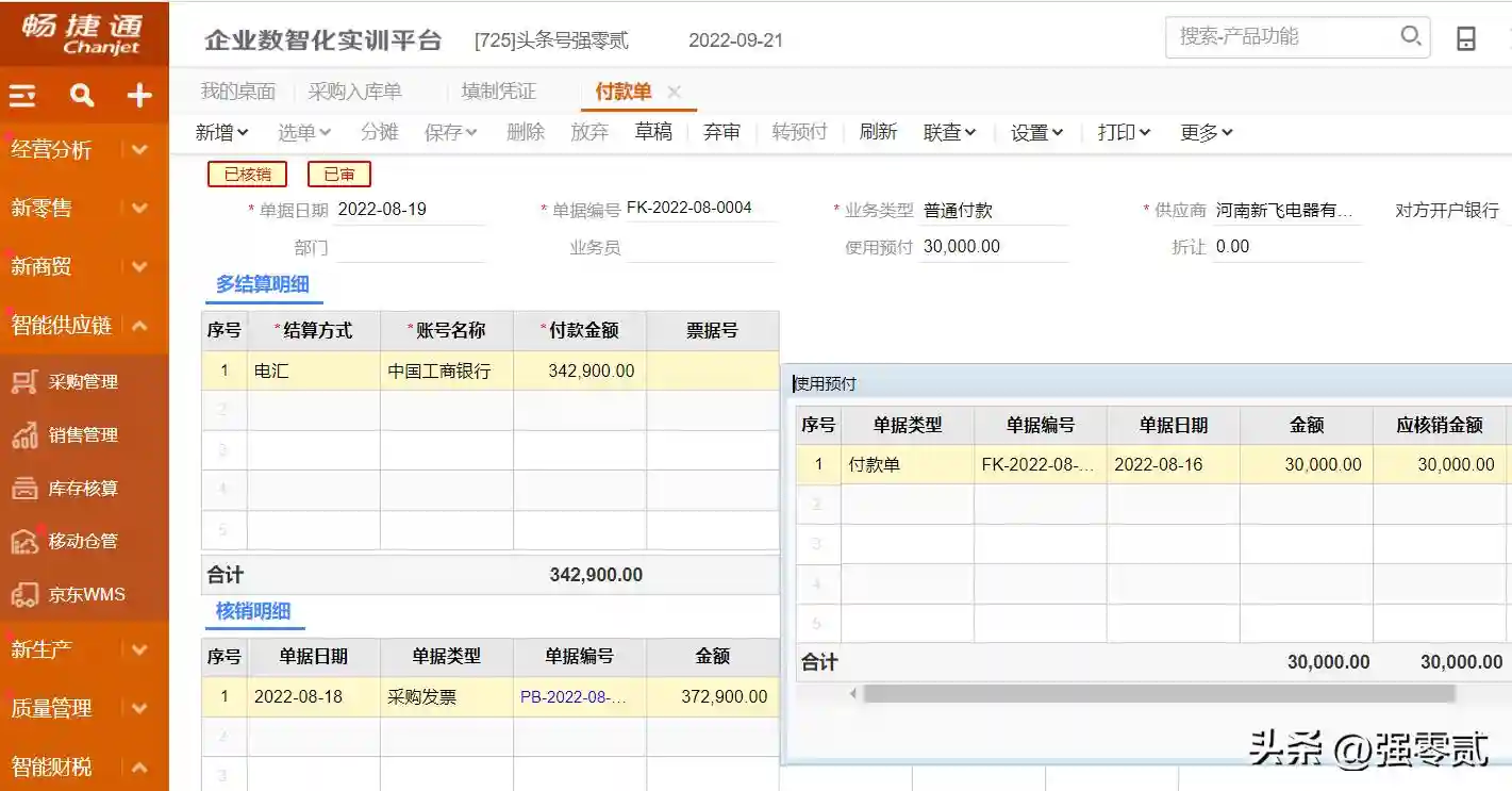 d.货款支付使用采购付款单来处理【智能供应链】-【往来现金】-【付款单】
