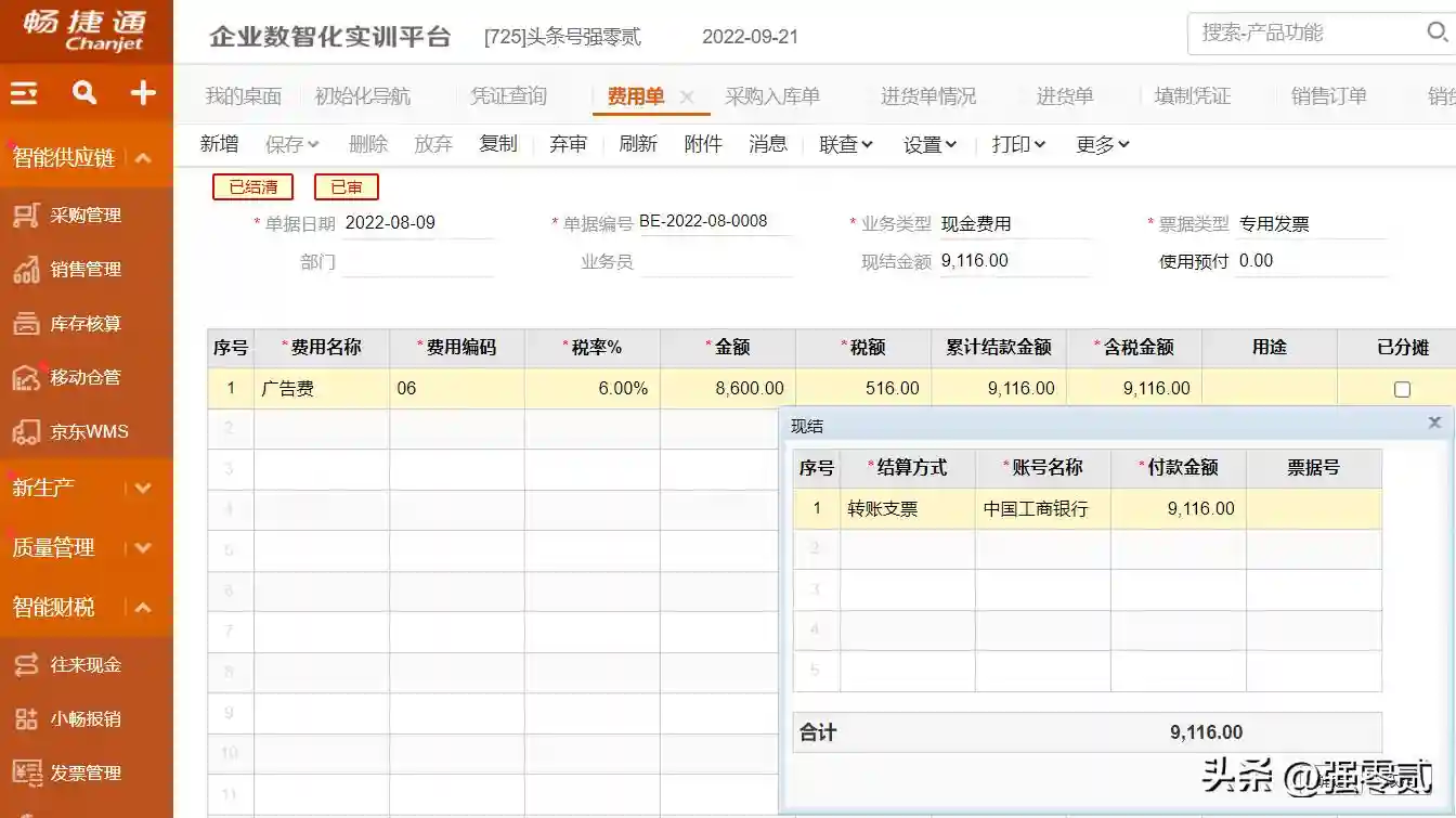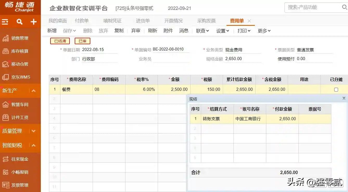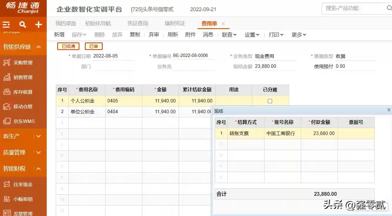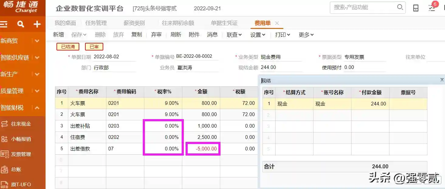 a.【智能财税】-【往来现金】-【费用单】表头的部门、业务员默认记忆录入内容,需要删除后,重新选择。业务类型:现金费用票据类型:专用发票