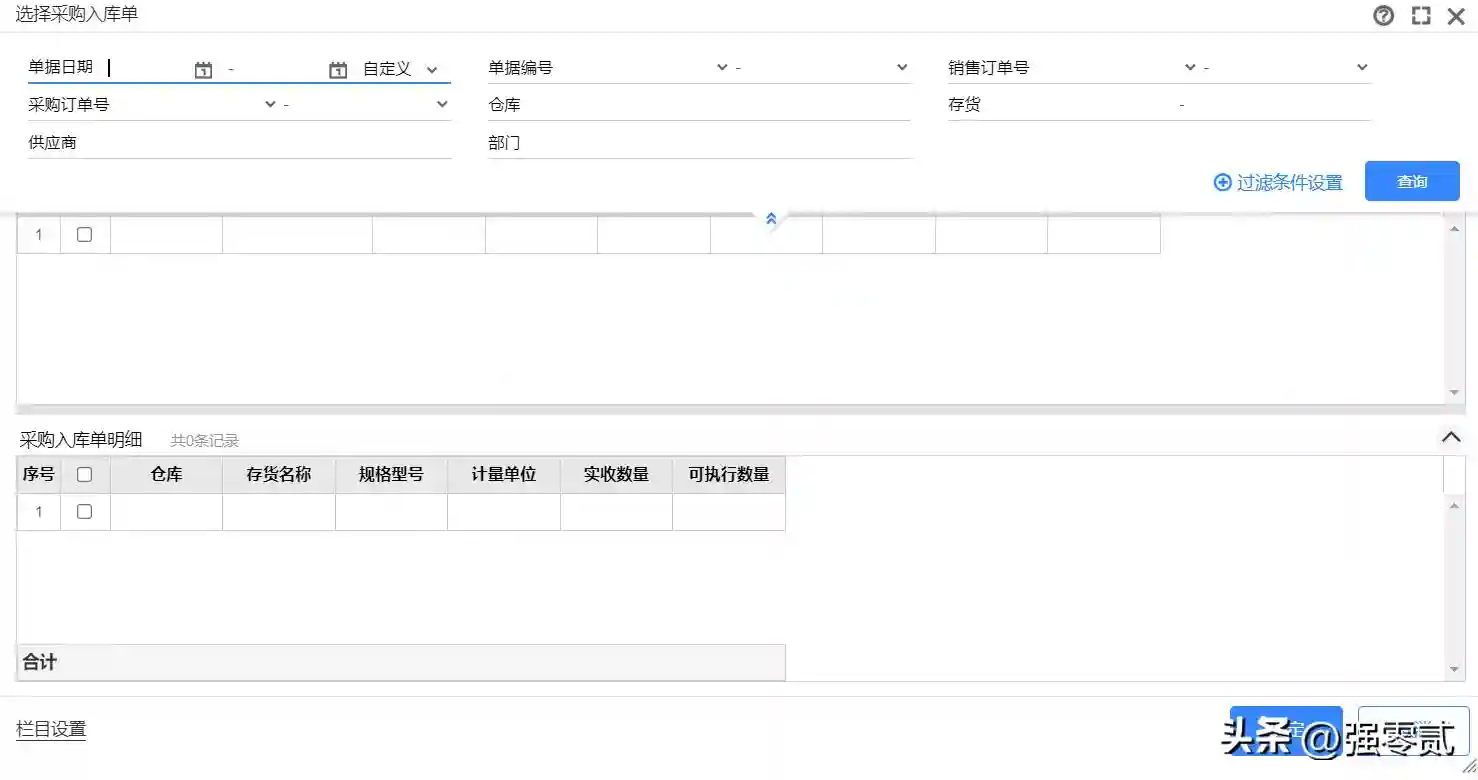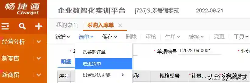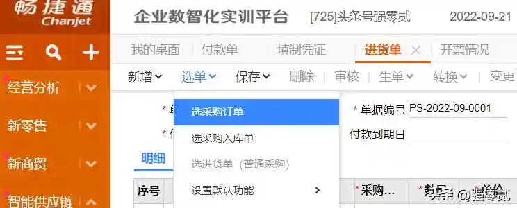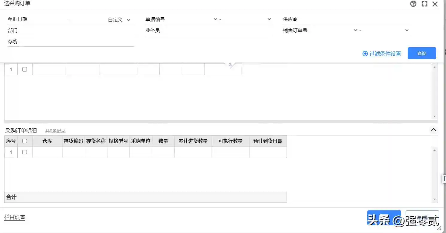 b.【选单】-【选进货单】-【查询】记录显示后,勾选单价生成采购入库单