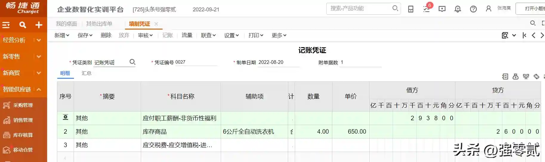 由于洗衣机发放存在不同部门,分别计入管理费用、销售费用。手工核算后