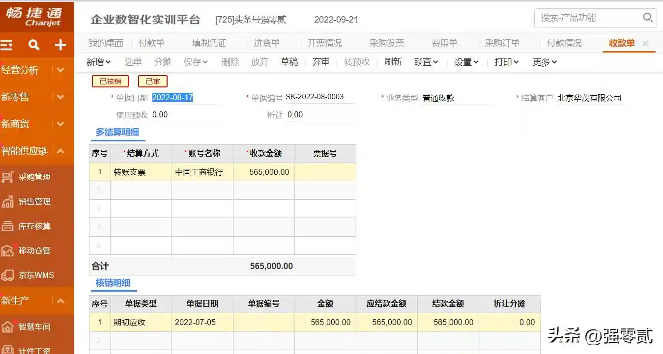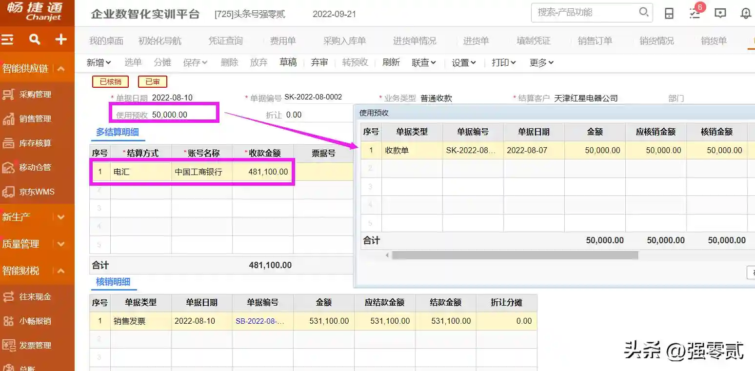 多多结算明细:结算方式(电汇)收款金额(481100.00)表头使用预收栏目:核销订金