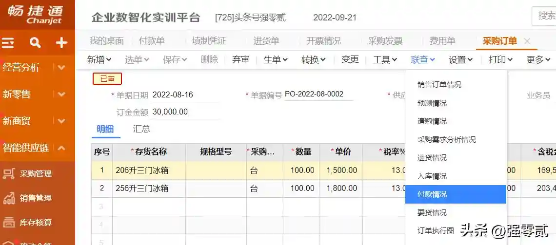 b.对采购订单【保存】-【审核】-【联查】-【付款单情况】