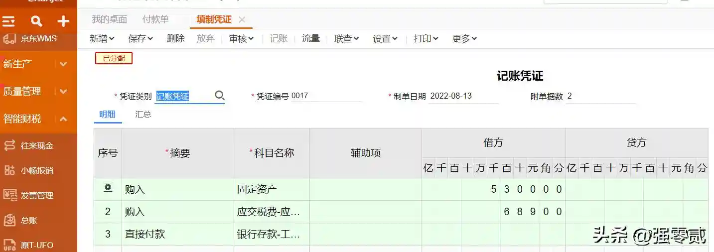 合并号新增资产和付款单记录均改为:1【查看明细】完善科目,由于应付账款借贷方均有相同金额发生,分录抵消删除后再【保存】