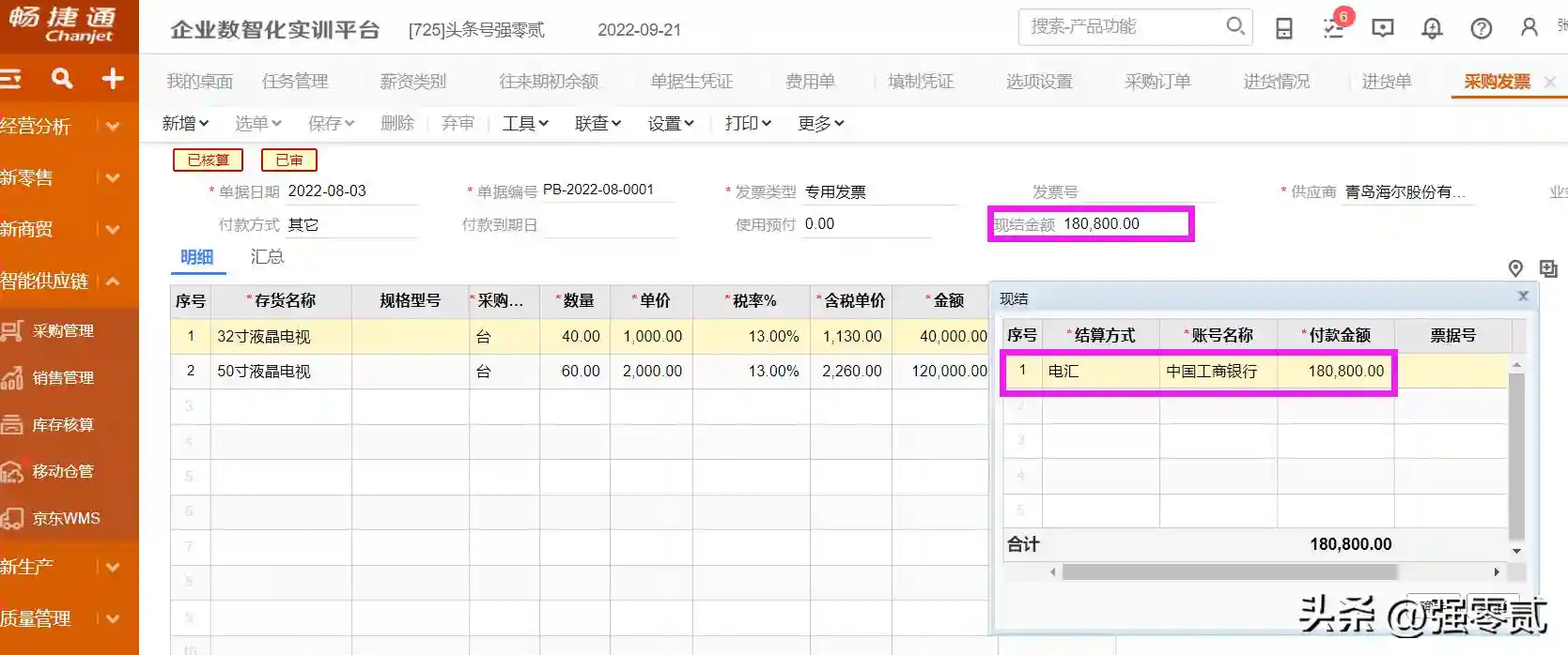 g.在生成的采购发票界面【现结金额】点开放大镜录入:电汇工商银行180800.00