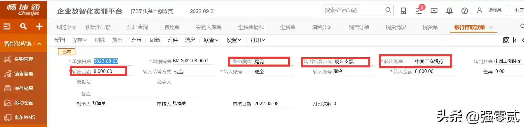 a.【智能财税】-【往来现金】-【银行存取款单】业务类型:提现结算方式:现金支票