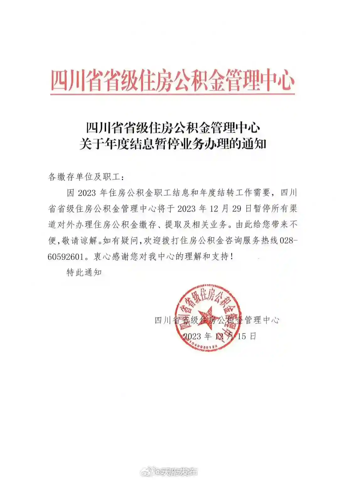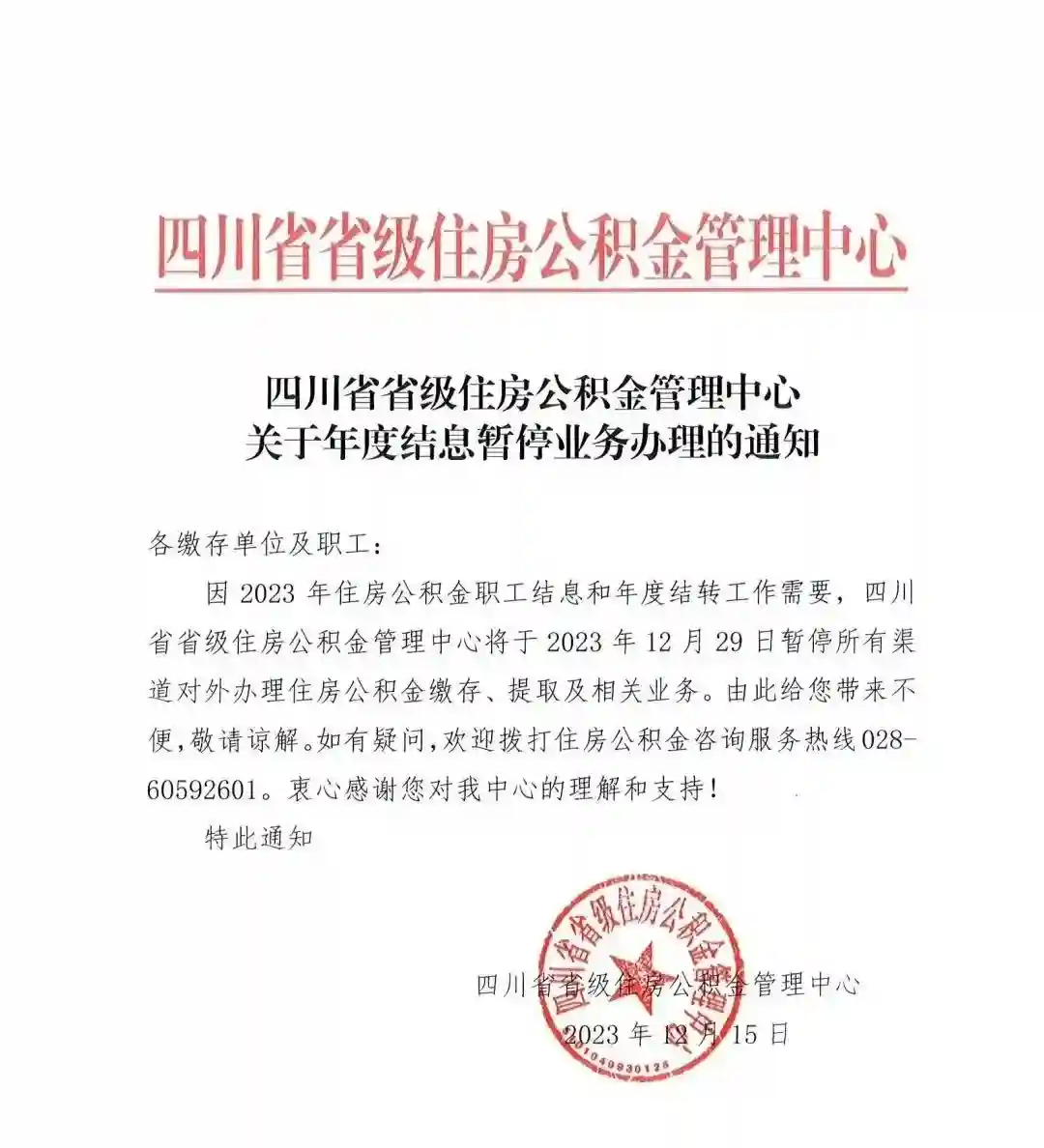 日前,四川省省级住房公积金管理中心发布关于年度结息暂停业务办理的通知,12月29日暂停所有渠道对外办理住房公积金缴存、提取及相关业务。(四川发布)