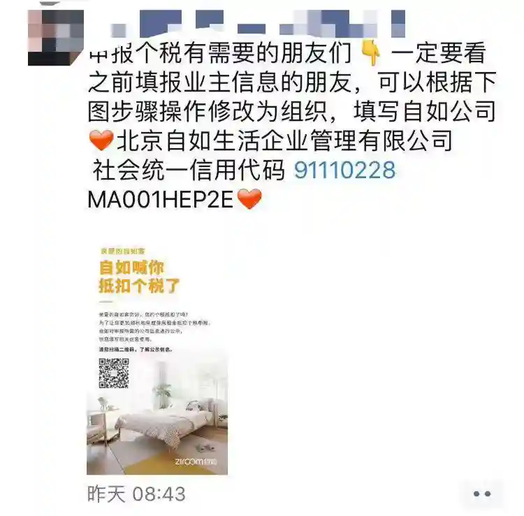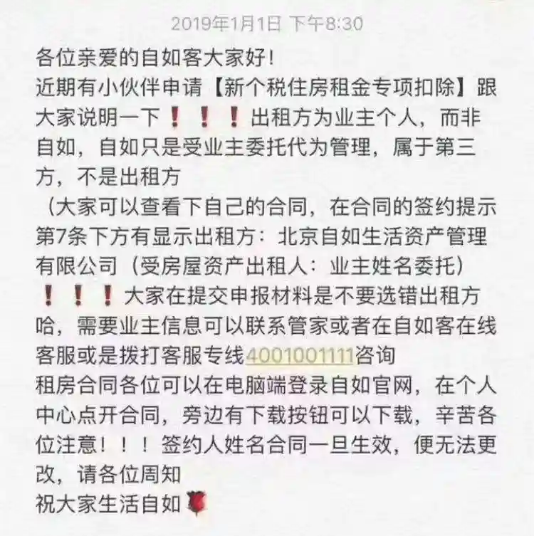 隔天,1月2日,北京自如生活资产管理有限公司(简称“自如”)相关工作人员在微信朋友圈发布通知,内容如下: