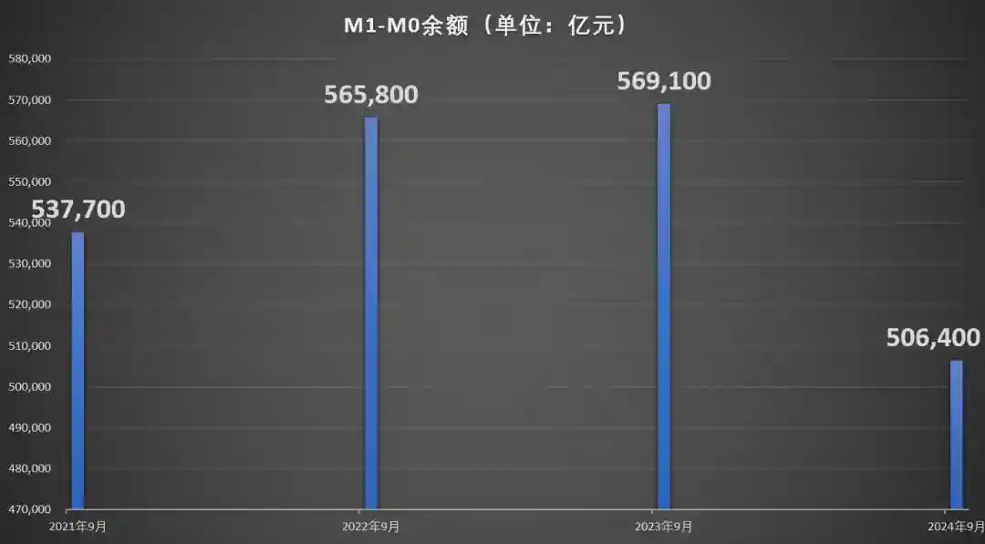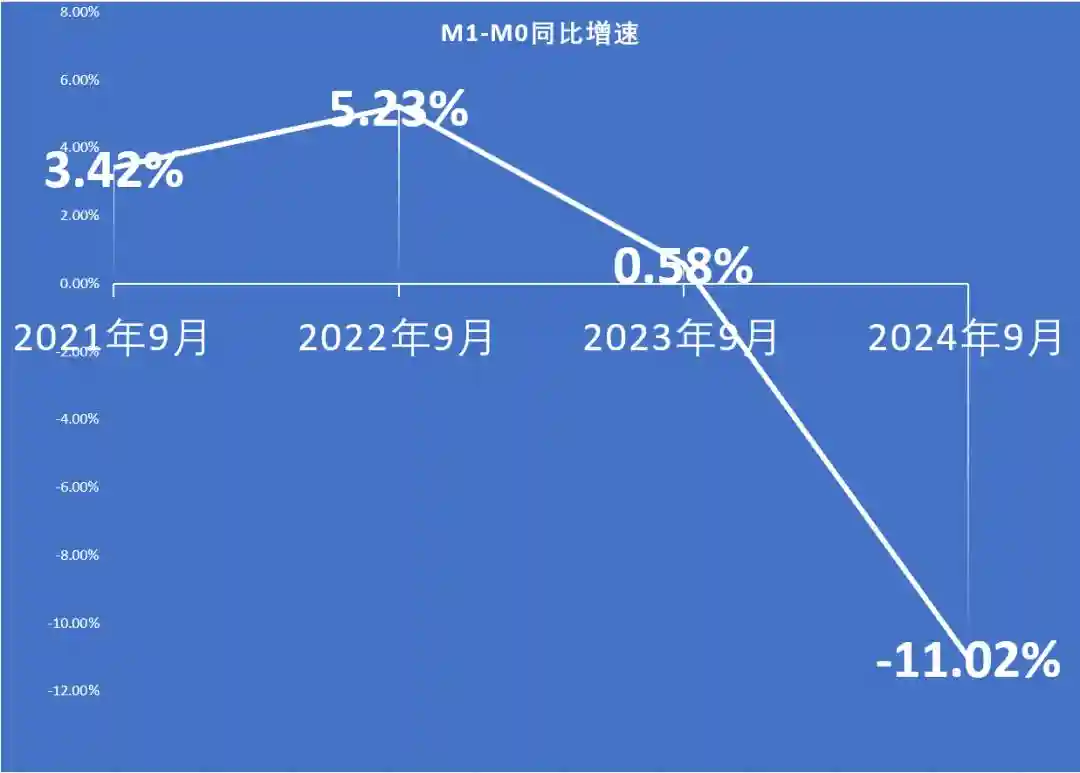 根据央行提供的M1和M0数据简单计算可知,2024年9月末,M1-M0的差值为50.64万亿元,与2023年9月相比,这个数据同比下降高达11.02%,M1-M0比去年同期少了6.27万亿元。