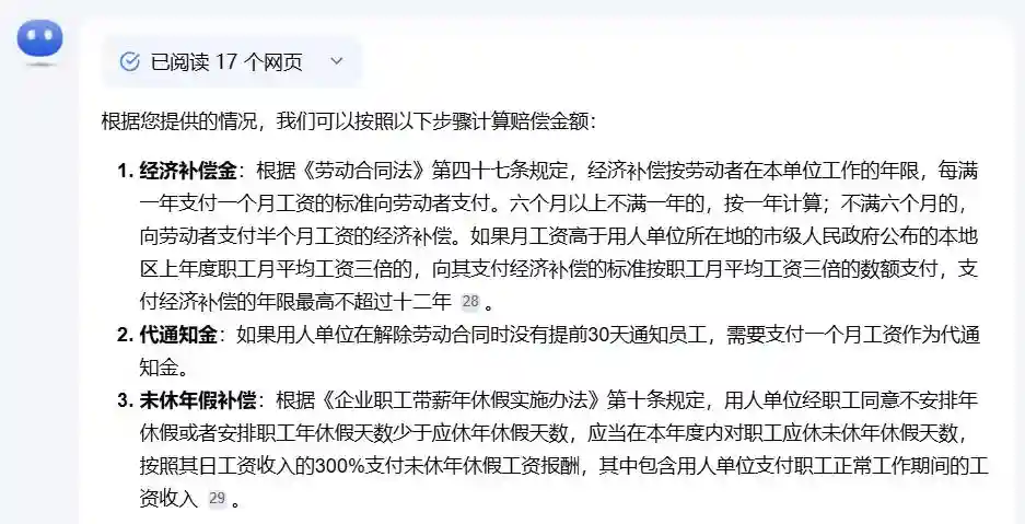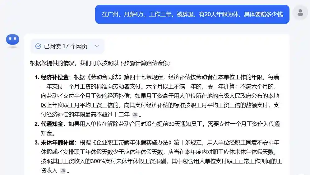 如果要自己查劳动法,就很难找到关键信息。用搜索,也是非常零碎。现在AI工具也挺多,比搜索的好处,会进行信息汇总,结果输出满足规则的说明,公式的计算,甚至可以帮你计算赔偿金额。