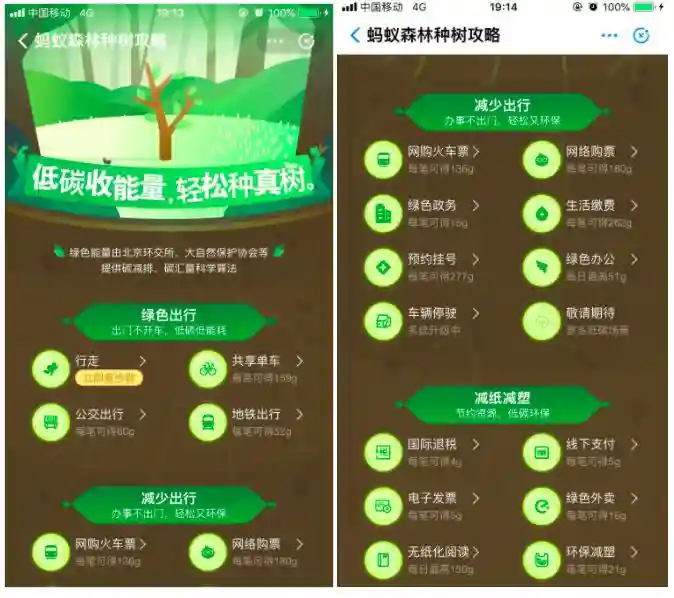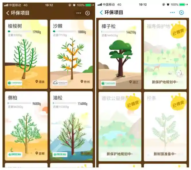 2016年推出模拟养成游戏——蚂蚁森林,它的玩法相信很多人都知晓,用户可以在支付宝缴纳水电费,购物支付等绿色行为,这些行为会被转化为虚拟的“绿色能量”,是养成一颗。虚拟树长成后,支付宝蚂蚁森林和公益合作伙伴就会在地球上种下一棵真树,或守护相应面积的保护地,用以培养和激励用户的低碳绿色环保行为。