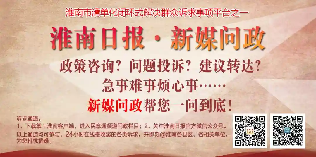 扫一扫下载掌上淮南客户端,进入民意通频道问政栏目;官方微信公众号。以上通道均可参与,24小时在线接收您的各类诉求,并即刻@淮南各县区、各相关单位,为您排忧解难。