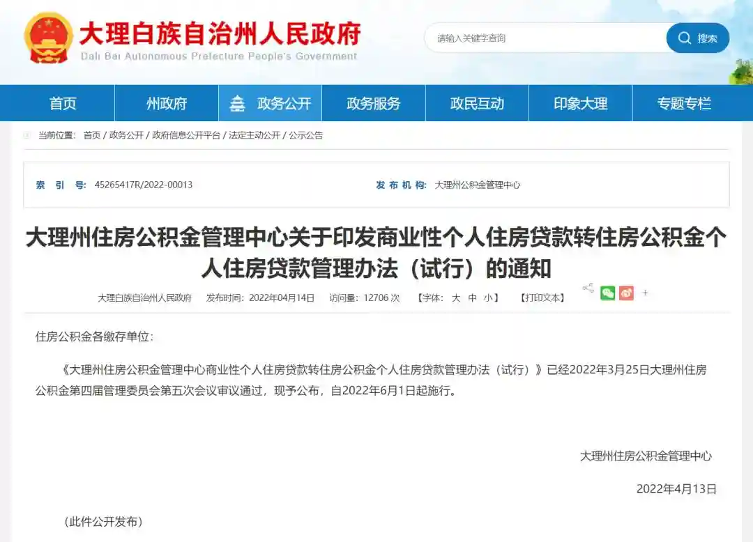《大理州住房公积金管理中心商业性个人住房贷款转住房公积金个人住房贷款管理办法(试行)》(以下简称《办法》)根据国务院《住房公积金管理条例》、《大理白族自治州住房公积金个人贷款实施细则》和《大理州住房公积金资金流动性风险管理应急预案》等规定制定而成,已经2025年3月25日大理州住房公积金第四届管理委员会第五次会议审议通过,将于2025年6月1日起施行,至2025年5月31日,有效期3年。