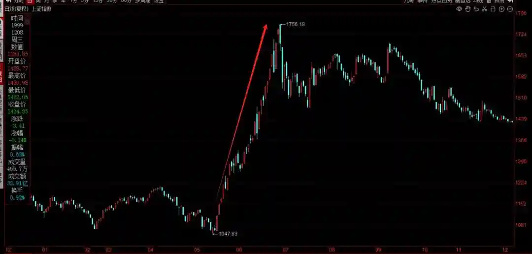 1999年5月17日到1995年6月30日,上证指数从最低点1047点上涨到高点1756点,短短2个月不到的时间,上证指数涨幅高达68%。由于启动的那一天是5月19日,俗称5.19行情。随后,行情持续了2年,于2001年6月14日结束。上证综指,从1057点启动,收于2245点,累计涨幅111.58%。