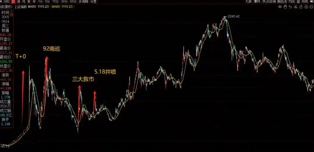 1992年2月份开始,上交所陆续放开了股票的涨跌停板限制。1992年5月21日,上海证券交易所实行T+0制度,当天上证指数大涨105%!对!你没看错,大盘一天翻倍!直到1995年开始实行T+1制度,持续至今。