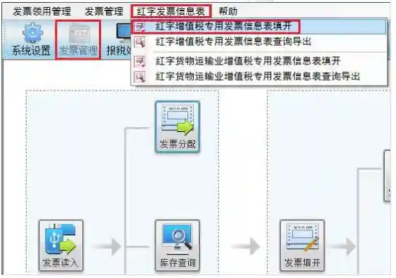 6.下拉菜单选择‘红字增值税专用发票信息表查询导出’菜单中单击选择对应单号进行‘上传’操作;7.在‘红字增值税专用发票信息表查询导出’菜单中单击选择对应单号进行‘下载’操作;