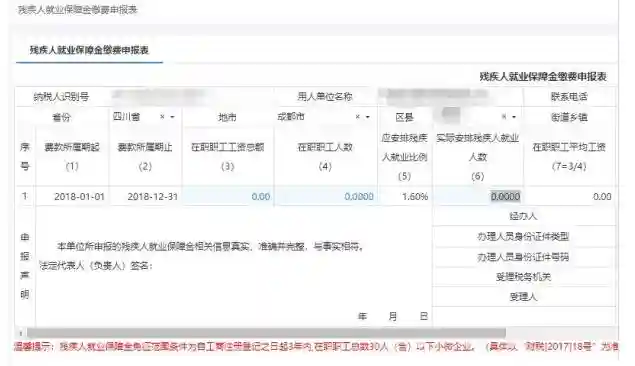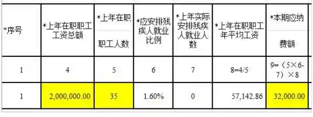 你依次填写好在职职工工资总额、在职职工人数、实际安排残疾人就业人数即可,其他的数据就自动产生了,应该缴纳的费额也就自动产生了。